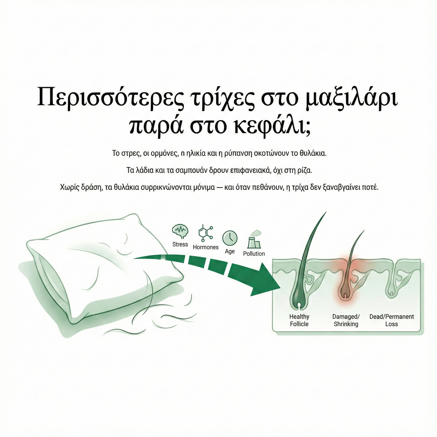Στρες, ορμόνες, ηλικία, ρύπανση σκοτώνουν θύλακες. Έλαια/σαμπουάν δρουν επιφανειακά, όχι στη ρίζα. Χωρίς δράση, συρρικνώνονται μόνιμα. Μόλις πεθάνουν, τα μαλλιά σταματούν να φυτρώνουν για πάντα.